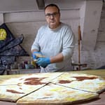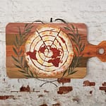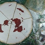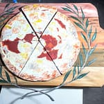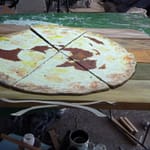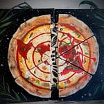 En la antigua Grecia, donde los campeones eran coronados con ramas de olivo, el olivo simbolizaba la transferencia de poder. Reyes y emperadores eran ungidos con aceite. Desde Noé, cuando una paloma trae una rama de olivo, significa paz. Encarna fuerza y vigor. El bastón de Hércules era un tronco de olivo, y Cristo fue apresado en el Monte de los Olivos y clavado en una cruz de madera de olivo. Los romanos difundieron ese conocimiento y más tarde dotaron a la pizza entre ramas de olivo. Ese plato que a todos nos gusta. Cortado a lo largo y sazonado con salsa entre paralelos con salami continental. Todos la apreciamos, queremos comerla, y se nos está acabando. Digan lo que digan, la Organización de las Naciones Unidas es una copia de ese legado culinario y cultural romano que es nuestra nave espacial. Quiero retroceder en el tiempo para que no la terminemos. La sazoné con magia vudú e inserté algunos números del oscuro pasado en salsa picante, como un reloj de albahaca retrógrado donde está China. Y más tarde, la enriquecí cortando la bandeja de servir pizza a la mitad para cubrir las esquinas y darle un toque espacial para ver nuestro Planeta Pizza ¡hasta el infinito y más allá!