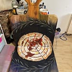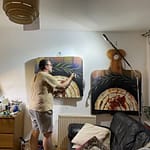 La abducción de los cazadores furtivos comienza a las diez. Esta pintura comenzó como un díptico triangular inspirado en los hermosos paisajes del controvertido Cotswold inglés. Encantador y rico en agradables colinas verdes, pero como nos recuerda tristemente el naturalista Sir David Attenborough, hablando de vida silvestre, es uno de los lugares más empobrecidos del planeta. Tenemos muchos dedos si queremos contar especies mientras caminamos por estos hermosos paisajes. En este momento, quedan pocos animales vivos, y todavía hay cazadores que se jactan de serlo. Entonces quise crear una abducción alienígena para limpiar el desorden. Y el símbolo del reloj dice eso: LA ABDUCCIÓN DE LOS CAZADORES FURTIVOS COMIENZA A LAS 10. Ahora le toca a la Vía Láctea, representada por la diosa egipcia Nut, doblar las líneas rectas; ella fue quien envió el reloj platillo volador, a través de ese portal cuántico dorado, para acelerar el cambio de nuestros malos hábitos de agricultura a campo abierto con poco respeto por la vida animal. Señales reales de un futuro más redondo para todos.